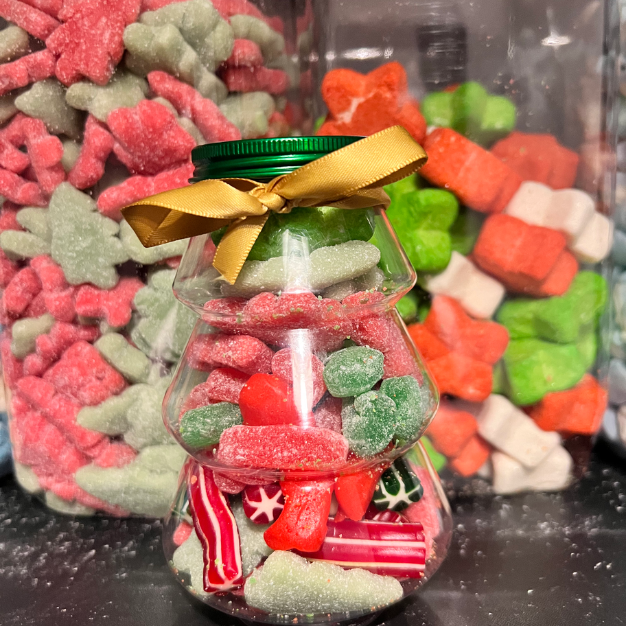 Our Christmas tree themed festive jars are filled with 350g of our green and red festive pick n mix sweets. Full of textures and flavours , include fizzy and non fizzy choices. These make great stocking fillers or gifts.